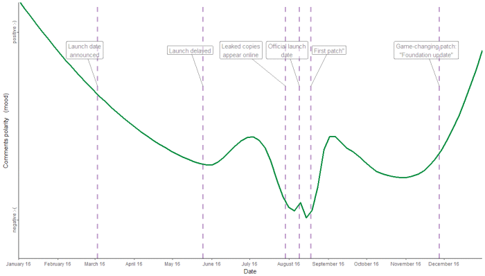 The following image depicts the real world information wrapped to a sentiment graph along with the timeline of events I mentioned above.(Source) The data was captured from Reddit data by Guillaume Couture-Piché, a data visualization passionate. Check his blog for more amazing posts about data science and visualization.