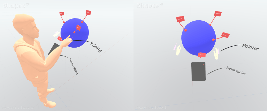This is an interaction design project I worked on top of the XR Interaction toolkit in Unity. The experience prototypes a VR news reader that can be selected based on locations.